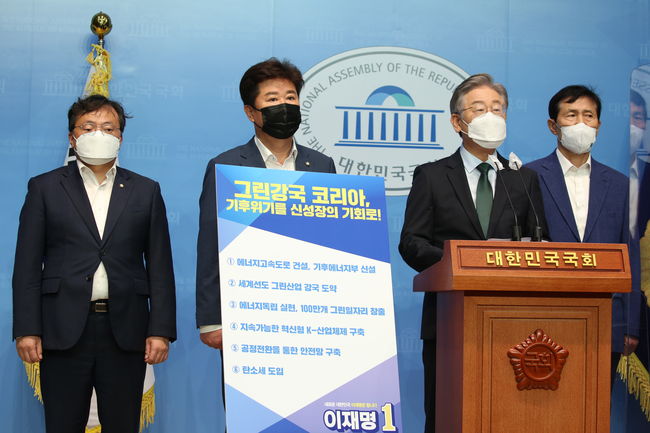 이날 이재명 경기지사가 발표한 공약은 ▲`에너지고속도로` 건설, `기후에너지부` 신설 ▲그린산업 전격 지원 ▲100만개 그린일자리 창출 ▲혁신형 K-산업 체제 구축 ▲그린산업 공정전환 보장 ▲탄소세 도입 등을 골자로 한다.