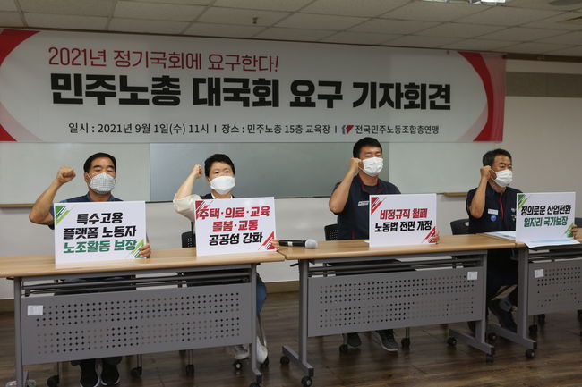 전국민주노동조합총연맹(이하 민주노총)은 1일 서울 중구 민주노총에서 `민주노총 요구안 발표 기자회견`을 열고 "2021년 정기국회는 한국사회대전환의 계기가 돼야 한다"고 주장했다.