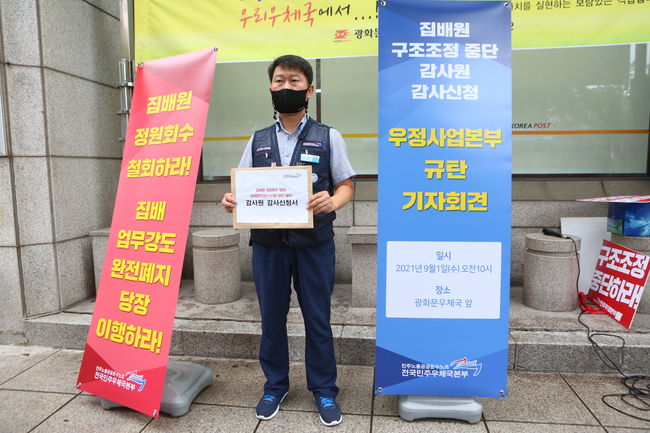 최승묵 전국민주우체국본부 위원장이 1일 서울 광화문 우체국 앞에서 감사신청서를 들고 서있다. 민주노총 전국민주우체국본부는 1일 서울 광화문 우체국 앞에서 기자회견을 열고 구조조정 중단을 촉구했다. 민주노총 전국민주우체국본부는 1일 서울 광화문 우체국 앞에서 기자회견을 열고 "우정사업본부가 노사합의를 파기하고 집배업무강도시스템을 활용하는 것과 일방적인 인력조정 행위 전반의 위법성에 감사를 청구한다"고 밝혔다.