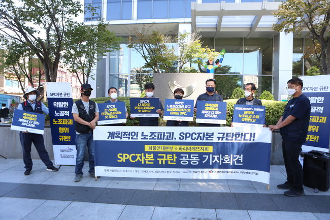 화물연대와 화섬식품노조는 17일 SPC그룹 본사 앞에서 `SPC자본 규탄 공동 기자회견`을 열고 "조합원에 해고협박, 손해배상 청구, 노조 탈퇴를 종용한 SPC자본을 규탄한다"고 밝혔다.