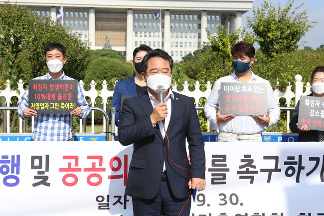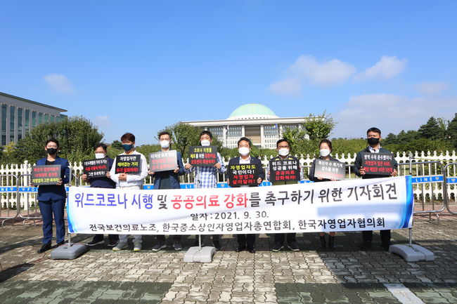 민병덕 더불어민주당 의원이 전국보건의료노조, 한국중소상인자영업자총연합회, 한국자영업자협의회와 함께 30일 국회 앞에서 `위드코로나 시행 및 공공의료 강화 촉구 기자회견`을 열고 "자영업자 규제 중심의 방역정책을 지양하고 전 국민 생활 방역 체제로 전환해야 한다"고 주장했다.