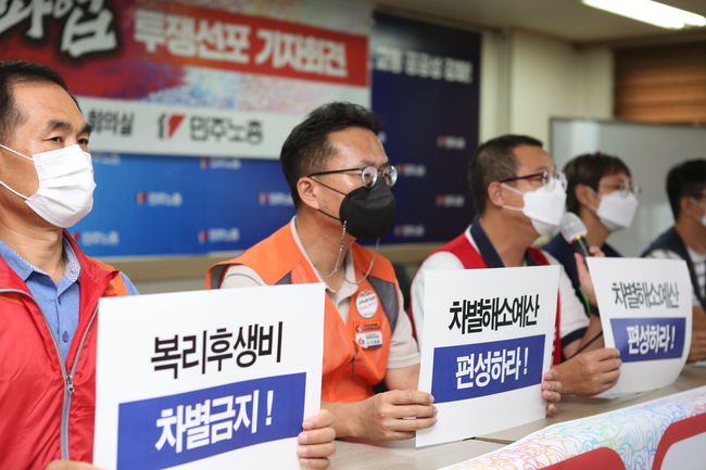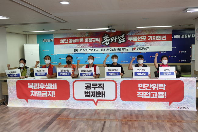 민주노총 측은 정부·국회에 ▲공무직 법제화 ▲복리후생비 차별금지 ▲민간위탁 직접고용 ▲차별해소예산 편성 등을 요구하고 있다.