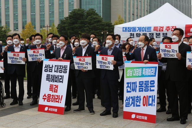 국민의힘 의원 60여명은 8일 오전 국회 본관 앞 계단에서 `대장동 게이트 특검 추진 천막투쟁본부 출정식`을 개최했다. 참석자 전원 왼쪽 가슴에 근조 리본을 달고 이재명 경기도지사 및 정부를 향해 특검수용을 촉구했다.