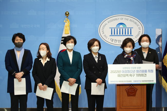이들은 이날 국회 소통관에서 `여성청소년 생리용품 보편지급 예산 증액 촉구 기자회견`을 열고 "여성가족부의 내년도 예산안을 증액해 생리용품 지급이 선별복지 방식이 아닌 모든 여성청소년에게 이뤄지게 해달라"고 촉구했다.