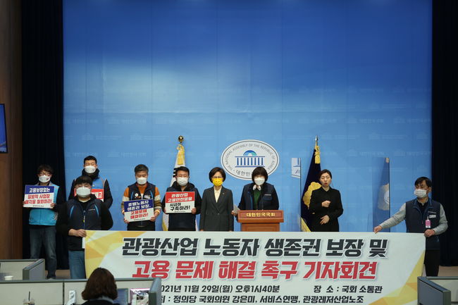강은미 정의당 국회의원, 전국서비스산업노동조합연맹(이하 서비스연맹), 관광레저산업노조는 29일 오후 국회 소통관에서 `관광산업 노동자 생존권 보장 및 고용 문제 해결 촉구 기자회견`을 열고 "지속가능한 관광산업을 위해 노동시장 유연화 관행을 개선해야 한다"고 주장했다.