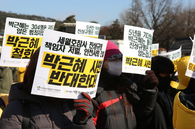 4·16 세월호참사가족협의회, 4·16연대, 민변세월호참사TF 등은 27일 청와대 앞에서 `박근혜 특별 사면 반대 기자회견`을 열고 "헌정질서 파괴와 국정농단을 거듭 자행한 박근혜를 사면하는 건 촛불시민의 염원을 짓밟은 촛불 배반"이라고 비판했다.