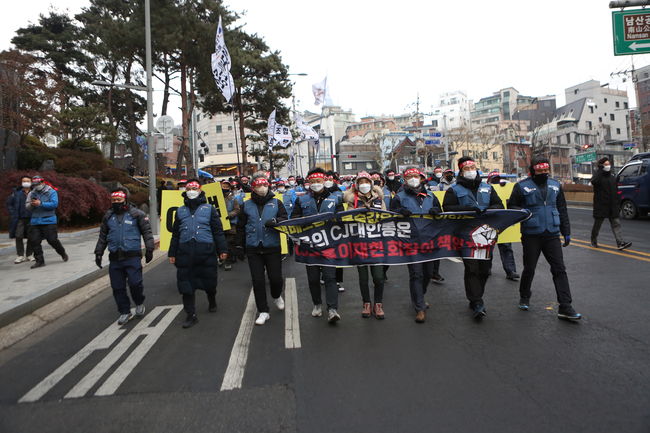 택배노조는 29일 오후 서울 중구 소재 CJ그룹 본사 앞에서 `CJ대한통운 총파업 결의대회`를 열었다. 택배노조는 29일 오후 서울 중구 소재 CJ그룹 본사 앞에서 `CJ대한통운 총파업 결의대회`를 열고 "총파업과 이로 인한 국민들의 불편에 대해 이재현 회장은 그룹 책임자로서 책임지고 해결에 나서야 한다"고 주장했다.