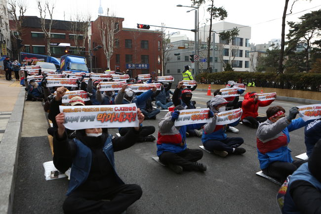 민주노총 택배노조 CJ대한통운본부(이하 택배노조)가 택배 요금 인상분의 공정한 분배 등을 요구하며 총파업에 나선 지 이틀째, 29일 오후 서울 중구 소재 CJ그룹 본사 앞에서 `CJ대한통운 총파업 결의대회`를 열고 이재현 CJ그룹 회장의 응답을 촉구했다.