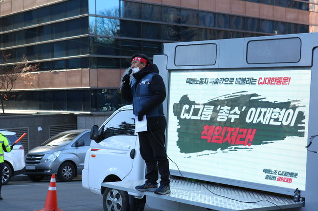 민주노총 전국택배노동조합 CJ대한통운본부는 31일 무기한 총파업 4일차를 맞이해 서울시 중구 소재 CJ그룹 본사 앞에서 `CJ대한통운 총파업 결의대회 및 차량행진`을 열었다.