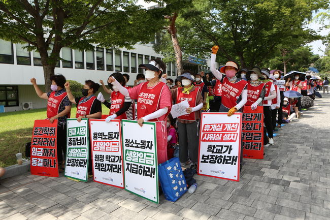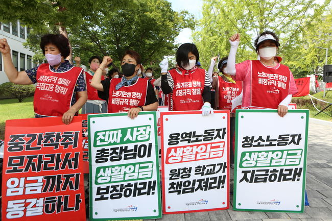 민주노총 공공운수노조 서울지역공공서비스지부는 27일 연세대학교 백양관에서 `대학사업장 집단교섭 투쟁 결의대회`를 열고 대학 청소노동자의 임금 인상 등 처우개선을 요구하고 나섰다. 결의대회 참가자들은 원청인 대학이 직접 문제 해결에 나설 것을 촉구하면서 "대학은 코로나 핑계로 저임금을 받고 있는 용역노동자들의 희생을 강요하고 있다"며 "원청인 학교가 문제를 하루빨리 해결해야 한다"고 밝혔다.