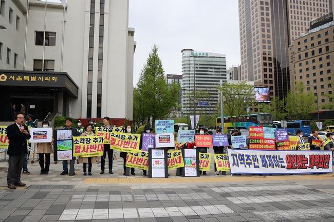 서울시 마포구민들이 14일 서울시의회 앞에서 기자회견을 통해 ‘쓰레기 소각장 추가 건립 계획 전면 백지화’를 촉구했다.