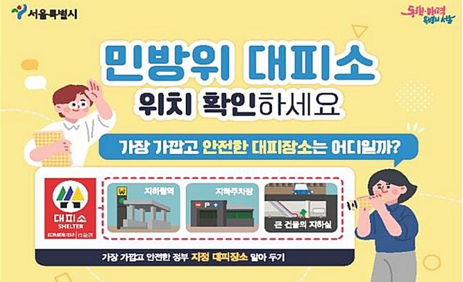 서울시는 최근 이스라엘-팔레스타인 분쟁 등 국제 안보 위기가 고조되는 가운데 한반도 안보 위협 상황을 우려하는 시민불안을 덜어주고, 유사시를 대비하여 사전에 가까운 대피공간을 확인해 둘 수 있도록 ‘우리동네 민방위대피소’ 찾는 법을 안내했다.