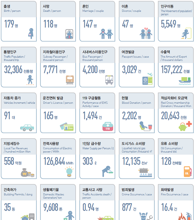 서울의 하루는 어땠을까? 하루 평균 179명이 태어나고, 118명이 사망했다. 147쌍이 부부가 됐고, 47쌍의 부부가 이혼했다. 777만명이 지하철을,420만명이 버스를 이용했으며, 교통사고로 0.94명이 사망했다.