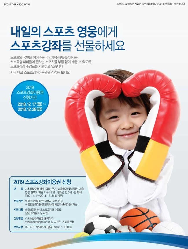 신청기간은 2018년 12월 17일(월)부터 12월 28일(금)까지이며, 거주 자치구청 및 스포츠강좌이용권 홈페이지를 통해 신청이 가능하며, 신청자 중 선정기준에 따라 범죄피해가구, 기초수급 생계․의료․주거 급여 대상자, 교육급여․차상위계층 대상자 순으로 선정한다.