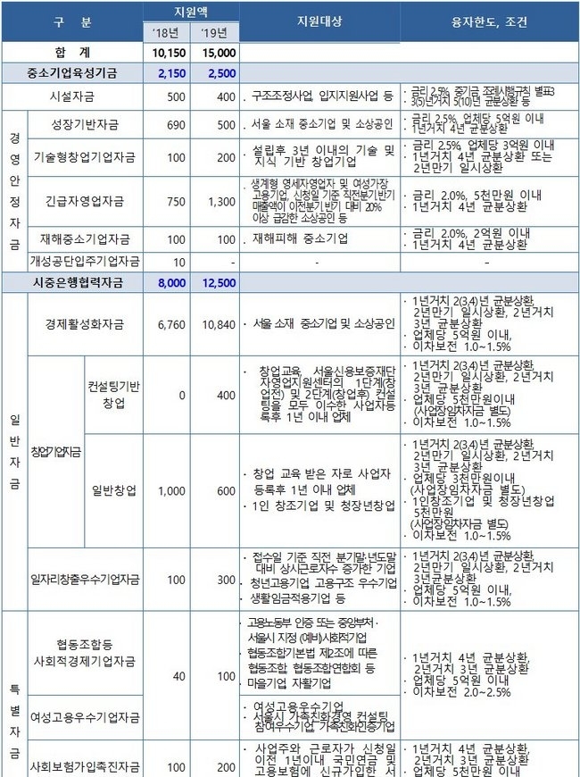 2018년(1조150억)보다 약 5000억원 증액한 지원자금 1조5000억원은 ‘서울시중소기업육성기금 직접융자금 2500억원’, ‘시중은행협력자금’ 1조2500억원으로 구성되어 있다.