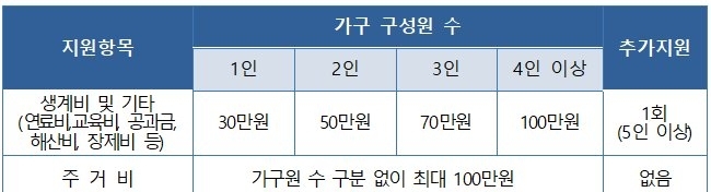 일용직 근로자 등 한파로 인한 실직, 휴․폐업으로 생계유지가 어려운 가구에 생계비를 최대 100만원 지원한다. 전기매트, 동계의복, 침낭 등 방한용품의 현물 지원도 가능하다.