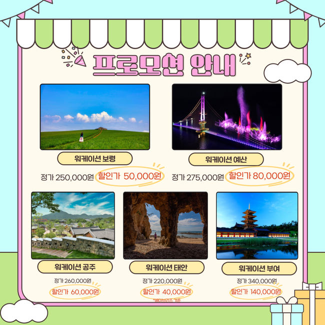 정상가 27만 5000원의 예산 프로그램은 8만원, 26만원인 공주 프로그램은 6만원, 22만원인 태안 프로그램은 4만원, 34만원인 부여 프로그램은 14만원에 이용할 수 있다.