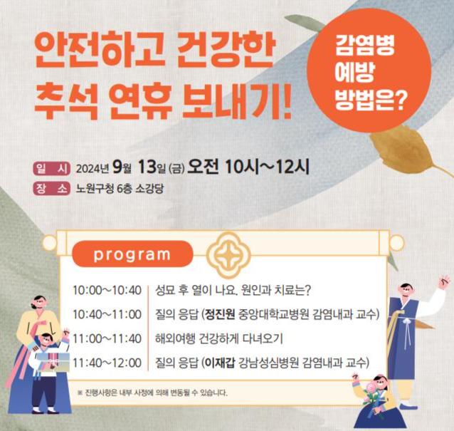 강연은 `안전하고 건강한 추석 연휴 보내기, 감염병 예방 방법은?`이란 주제로 시민 대상 공개로 진행되며 오는 9월 13일 오전 10시 노원구청 6층 소강당에서 개최된다. 원활한 강연을 위해 사전 신청은 필수다. 26일부터 노원구 보건소 생활보건과로 전화 또는 담당자 이메일, 홍보물에 포함된 QR코드를 통해 선착순으로 이뤄진다.