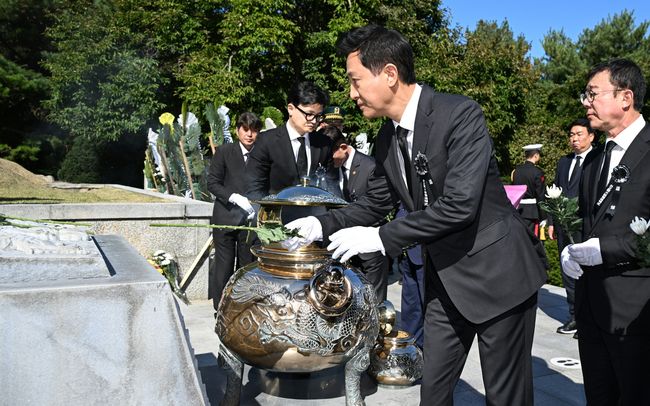 오 시장은 헌화를 마친 뒤 묘역 입구에 마련된 방명록에 ‘국가번영의 유지를 받들어 더 밝은 미래를 만들어 가겠습니다’라고 추도글을 남겼다.