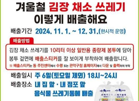 배출방법은 일반 종량제 봉투 겉면에 김장 쓰레기 전용 스티커를 부착해 18시∼24시 사이에 내 집 앞과 내 점포 앞에 배출하면 된다. 다만 토요일은 배출 기간에서 제외된다.