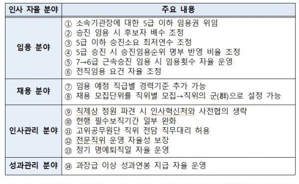 특례안은 공무원의 신분보장, 공정채용, 공직 전문성 등 인사 원칙을 훼손하지 않는 것을 기본 원칙으로 하면서도 승진과 채용 등에 대해 현행 인사규정 대신 기관별 특성이 반영된 맞춤형 인사제도를 적용하는 것으로 주요 내용은 다음과 같다.