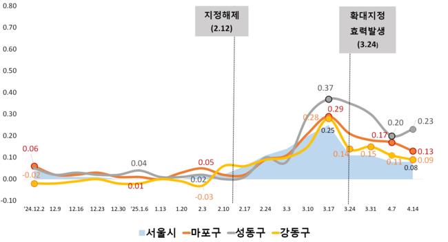 서울시는 마포·성동·강동 등 인접 지역의 상승세도 주춤해졌다며 '풍선효과'가 없다고 단언했다. 하지만 이는 현재 고금리와 대출 규제가 맞물린 일시적인 소강상태일 뿐이다. 토지거래허가구역 지정으로 억눌린 수요는 사라지는 것이 아니라 잠재되어 있을 뿐이며, 향후 금리 인하 등 외부 요인이 변화할 경우 규제를 피한 지역이나 규제가 풀리는 시점에 폭발적으로 분출될 위험이 크다.