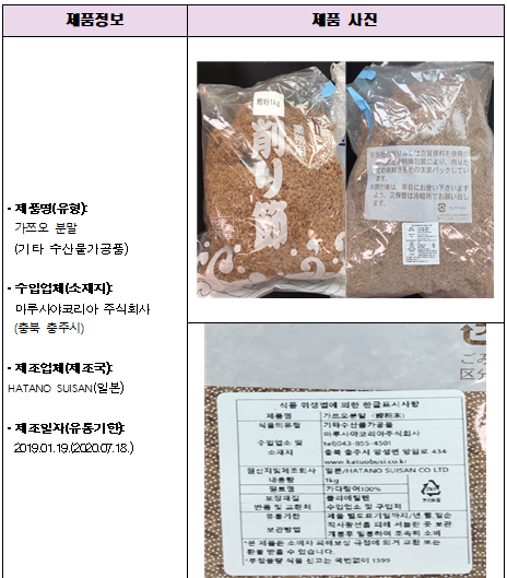 식품의약품안전처는 수입식품판매업체 ‘마루사야코리아 주식회사’가 수입·판매한 ‘가쯔오 분말’에서 벤조피렌이 기준 초과 검출돼 해당 제품을 판매중단 및 회수 조치한다고 18일 밝혔다.