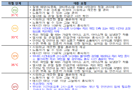 고용노동부는 폭염이 심화됨에 따라 노동자의 건강보호를 위하여 폭염시 무더위 시간대 옥외작업 작업중지 권고 온도를 35℃로 낮춰 현장 지도하도록 했다.