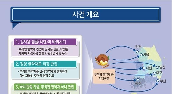 일부 한약재의 경우 부적합 판정을 받은 한약재 대신 국내외에서 확보한 상품가치가 떨어지는 동일한 품목의 다른 한약재를 국외 반송하고, 부적합 판정 수입 한약재를 서울, 경북 영천, 인천, 부산, 대구, 광주 등 수도권을 포함한 전국 약재시장, 한의원 등에 판매했다.