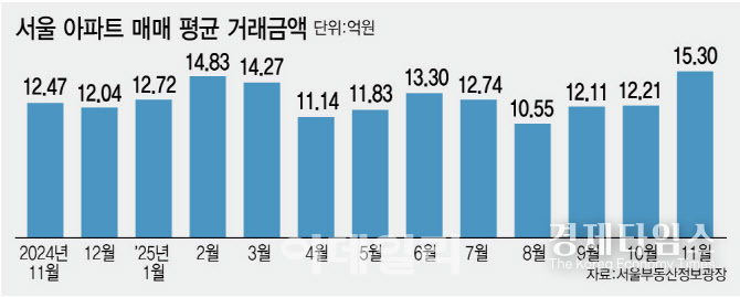11월16일 서울부동산정보광장의 부동산거래정보 통계에 따르면 이달 들어 서울 아파트 평균 매매거래금액은 15억 2,988만원(14일 기준)을 기록 중이다. 이는 직전 달인 10월 12억 819만원, 앞서 지난 9월 12억 1,107만원을 기록한 것과 비교해 3억원 이상 웃도는 수치다.