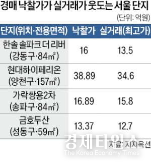 매매 최고가 수준으로 낙찰된 사례도 잇따랐다. 강동구 고덕동 ‘아남’(84㎡·13억8,929만원)과 성동구 금호동 ‘한신휴플러스’(59㎡·12억1,300만원), 송파구 잠실동 ‘현대’(84㎡·17억6,050만원) 등은 매매 최고가의 98~99% 수준에 낙찰됐다.