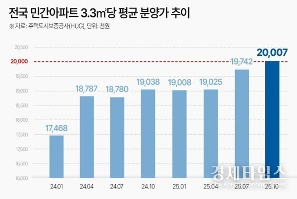 경제타임스 이준오 기자 | 올해 10월 기준으로 전국 민간 아파트의 3.3㎡(평)당 평균 분양가가 2000만원을 처음으로 넘어섰다. 분양가 상승의 배경으로는 공사비와 지가 상승으로, 분양가 상승세가 이어지면서 수요자들의 부담도 커지고 있다.