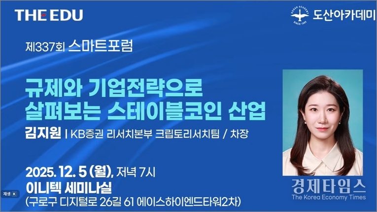 KB증권 김지원 연구위원은 12월5일 이니텍 세미나실에서 '제337회 도산아카데미 스마트포럼 강연'을 통해 스테이블코인 시장이 전통 금융 시스템과의 경계를 허물고 '온체인 금융' 시대를 열고 있다며, 한국 금융 당국의 신속한 규제 정비와 기업들의 적극적인 대응이 시급하다고 역설했다.