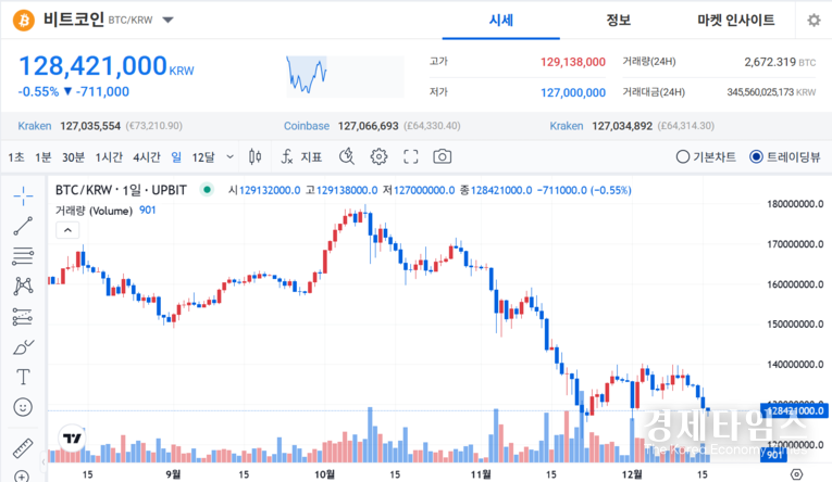 경제타임스 전영진 기자 | 비트코인이 미국의 긴축 기조 지속 및 일본의 금리 인하 기대 약화 등 이유로 1억2800만원대로 하락했다. 12월16일 오후 5시 25분 기준 가상자산 거래소 업비트에서 비트코인은 24시간 전보다 0.55% 하락한 1억2800만원대에 거래되고 있다. 달러 기준으로는 86510원대에 거래 중이다.