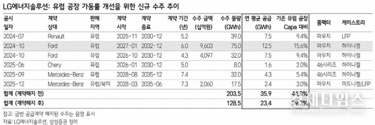 유안타증권은 이번 계약 해지를 포드의 유럽 전동화 전략 수정의 결과로 해석했다. 당초 포드와 LG에너지솔루션, 코치그룹은 튀르키예 합작공장(JV)을 추진했으나, 전기차 수요 둔화와 고금리 환경 속에 계획을 철회하고 폴란드 공장 공급으로 전환한 바 있다. 이후 총 109GWh 규모의 공급 계약이 체결됐지만, 이 가운데 차세대 모델에 대응하던 75GWh 물량이 최종적으로 해지됐다는 설명이다.