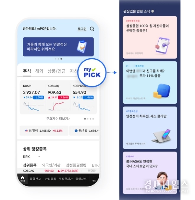 12월19일 삼성증권에 따르면 이번에 적용된 ‘마이픽(My Pick)’ 서비스는 이용자의 연령대, 관심 종목, 투자 성향 등 다수의 데이터를 분석해 맞춤형 투자 콘텐츠를 홈 화면에 배치하는 것이 특징이다. 이를 통해 고객은 별도의 메뉴 이동 없이 주요 투자 정보를 한 화면에서 확인할 수 있도록 했다고 밝혔다.