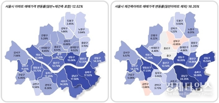 1월14일 부동산R114가 서울 아파트 매매가격 변동률을 조사한 결과, 2024년 말 대비 2025년 아파트값은 12.52% 올랐다. 자치구별로는 송파구(17.52%)와 강남구(17.50%)가 각각 17% 이상 오르며 높은 상승률을 기록했다. 이어 성동구(15.06%), 강동구(14.22%), 서초구(14.20%) 순이었다.