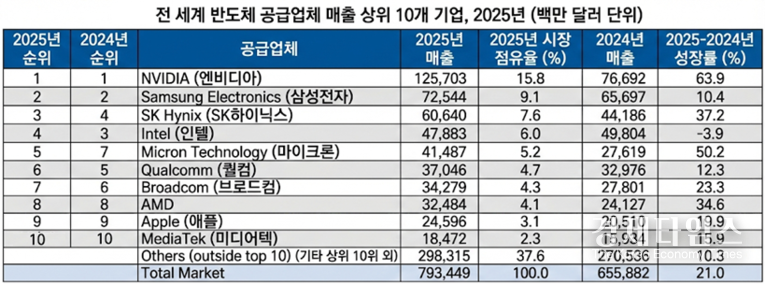 엔비디아는 반도체 업계 역사상 처음으로 연 매출 1천억달러 벽을 넘어서며 독주 체제를 굳혔다. 엔비디아의 지난해 매출은 1천257억300만달러(약 185조3천697억원)로, 전년 대비 63.9%의 폭발적인 성장세를 보였다. 시장 점유율 역시 15.8%로 1위를 질주했다.