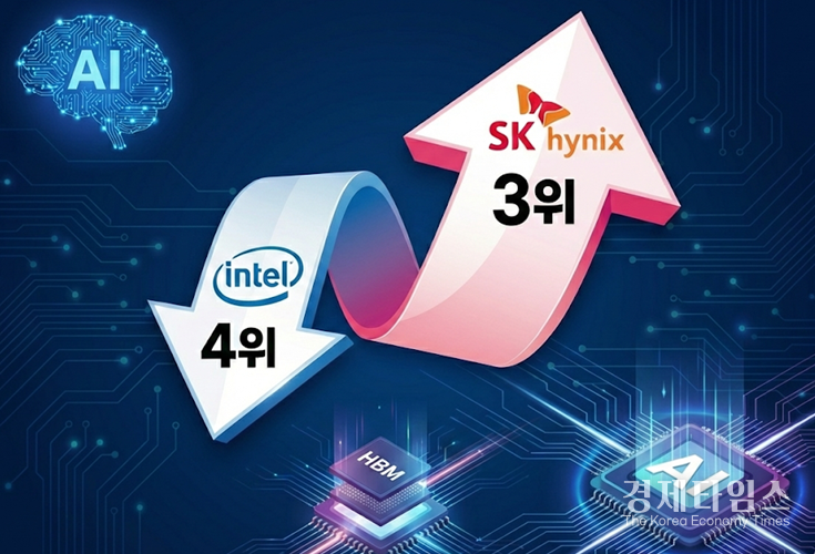 경제타임스 온인주 기자 | 인공지능(AI) 열풍이 글로벌 반도체 업계의 매출 순위 지도를 다시 그렸다. SK하이닉스가 고대역폭메모리(HBM) 시장 선점에 힘입어 인텔을 밀어내고 글로벌 반도체 매출 3위 자리를 꿰찼다. 반면 '반도체 제왕'으로 불리던 인텔은 매출 감소를 겪으며 4위로 내려앉았다.