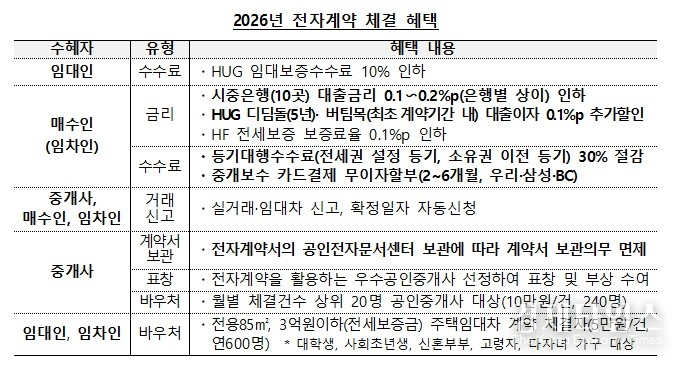 전자계약을 이용하는 매수인과 임차인은 시중은행 대출에서 0.1∼0.2%포인트의 금리 인하 혜택을 받는다. 등기대행수수료 30% 절감, 주택도시보증공사(HUG) 임대보증수수료 10% 인하 등 혜택도 지원한다.