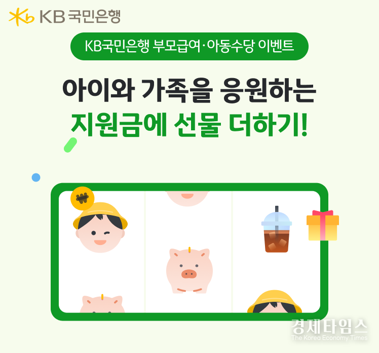 경제타임스 전영진기자 | KB국민은행은 저출산 극복 지원의 일환으로 부모급여와 아동수당을 수령하는 고객에게 혜택을 제공하는 '아이와 가족을 응원하는 지원금에 선물 더하기' 이벤트를 진행한다고 1월 23일 밝혔다.