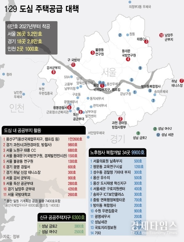 경제타임스 이준오 기자 | 정부는 서울 용산과 태릉, 경기 과천 등 핵심 요지를 총동원해 6만 가구 규모의 주택을 공급한다. 접근성이 좋은 수도권 공공 유휴부지와 국유지를 고밀 개발해 청년과 신혼부부의 주거 수요를 흡수하는 데 모든 역량을 집중키로 했다.