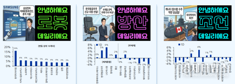 시장 지표 측면에서 양 연구원은 로봇 및 방산 섹터의 변동성을 정리했다. 로봇 시장에서는 한국피아이엠이 16% 급등하며 상승세를 주도했고, 티엑스알로보틱스(6%)와 뉴로메카(6%)가 강세를 보였다. 방산 부문에서는 LIG넥스원이 6% 상승하며 견조한 흐름을 보인 반면, STX엔진(-3%)과 아이쓰리시스템(-3%)은 하락세를 기록했다. 조선 분야는 대한조선이 4% 상승했으나 HD한국조선해양(-3%) 등 대형사들은 소폭 조정받았다.