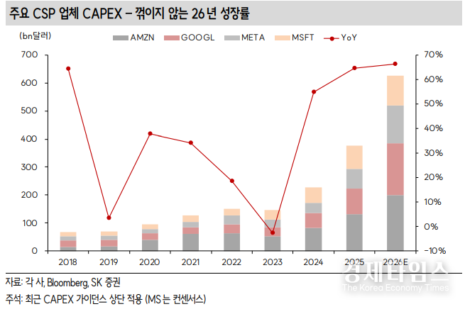 SK증권 이동주 연구원은 최근 분석 보고서를 통해 구글, 아마존, 메타, 마이크로소프트 등 글로벌 CSP 4사의 2026년 합산 CAPEX 성장률이 시장의 우려와 달리 전년 대비 66% 증가한 6250억달러(한화 약 830조원)에 달할 것으로 내다봤다. 이는 2024년(+55%), 2025년(+65%)에 이어 오히려 성장 폭이 매년 커지는 수치로, AI 산업의 실질적인 수요가 일시적 현상이 아닌 구조적 성장세임을 입증한다.