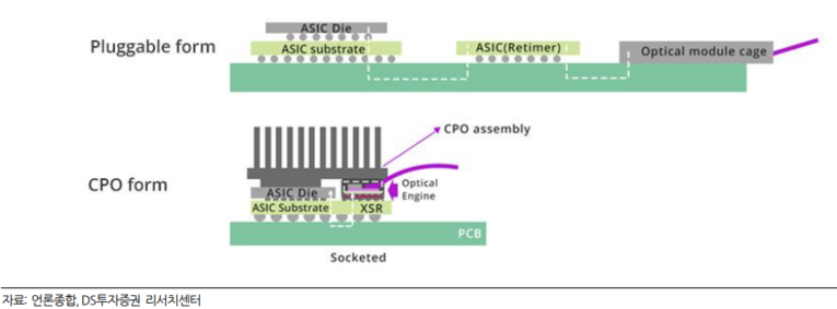▲ 기존 데이터센터 네트워크는 ASIC과 광모듈 사이 전기 신호 구간이 길지만, CPO는 광엔진을 칩 패키지 가까이 붙여 전력 손실을 줄이는 구조다. 자료=DS투자증권 리서치센터