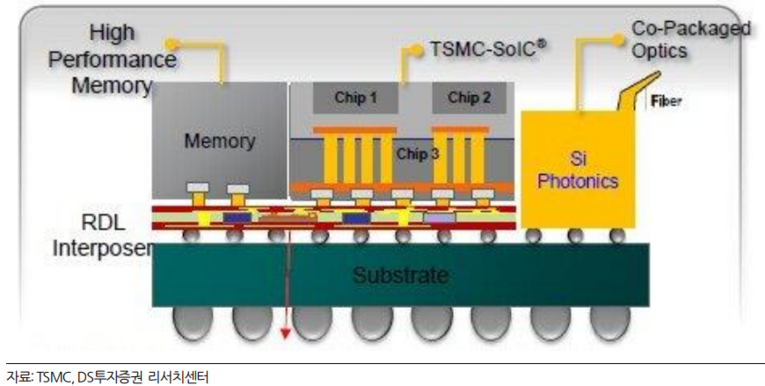 DS투자증권의 이수림 연구원은 CPO가 완성되려면 광 엔진뿐 아니라 스위치 칩, 광섬유 연결부 등 여러 요소를 하나의 패키지 안에 통합해야 하고, 이때 필요한 대표 기술이 CoWoS라고 설명했다.