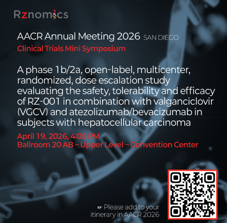 ▲ 알지노믹스는 AACR 2026에서 간암 환자를 대상으로 한 RZ-001 병용 임상 1b/2a상 데이터를 발표할 예정이다. 사진은 해당 세션 안내 이미지.