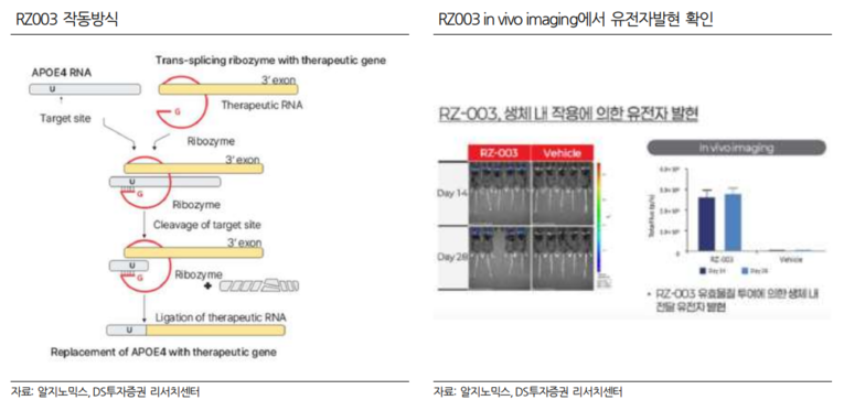 ▲ 알지노믹스의 알츠하이머 치료제 후보물질 RZ003은 문제를 일으키는 APOE4 RNA를 잘라내고 치료용 RNA를 이어 붙이는 방식으로 설계됐다. 오른쪽 이미지는 RZ003 투여 후 생체 내 유전자 발현이 확인된 결과를 보여준다. 자료: 알지노믹스, DS투자증권 리서치센