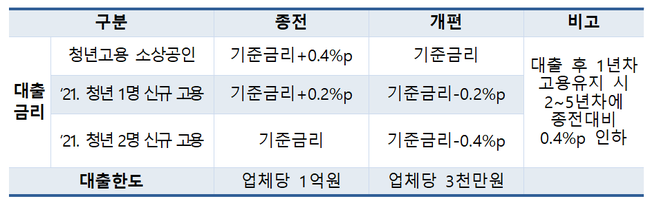 청년고용 소상공인이 대출 후 1년간 고용을 유지하는 경우, 1년 차에 1.73~2.13%이던 금리가 2년 차부터 0.4%p 낮은 1.33~1.73%로 인하된다.