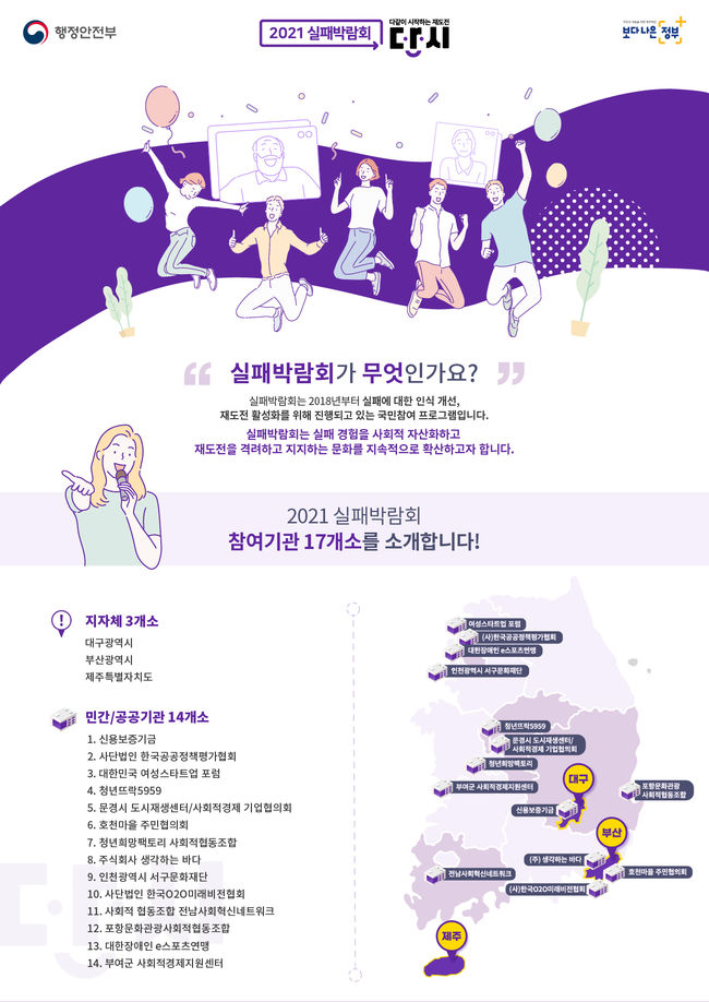 올해 `2021 실패박람회`는 지자체와 중앙부처 등과의 연계를 강화해 전국으로 재도전 문화를 확산시키고 온라인 채널을 확대해 국민 누구나 참여할 수 있도록 운영한다.